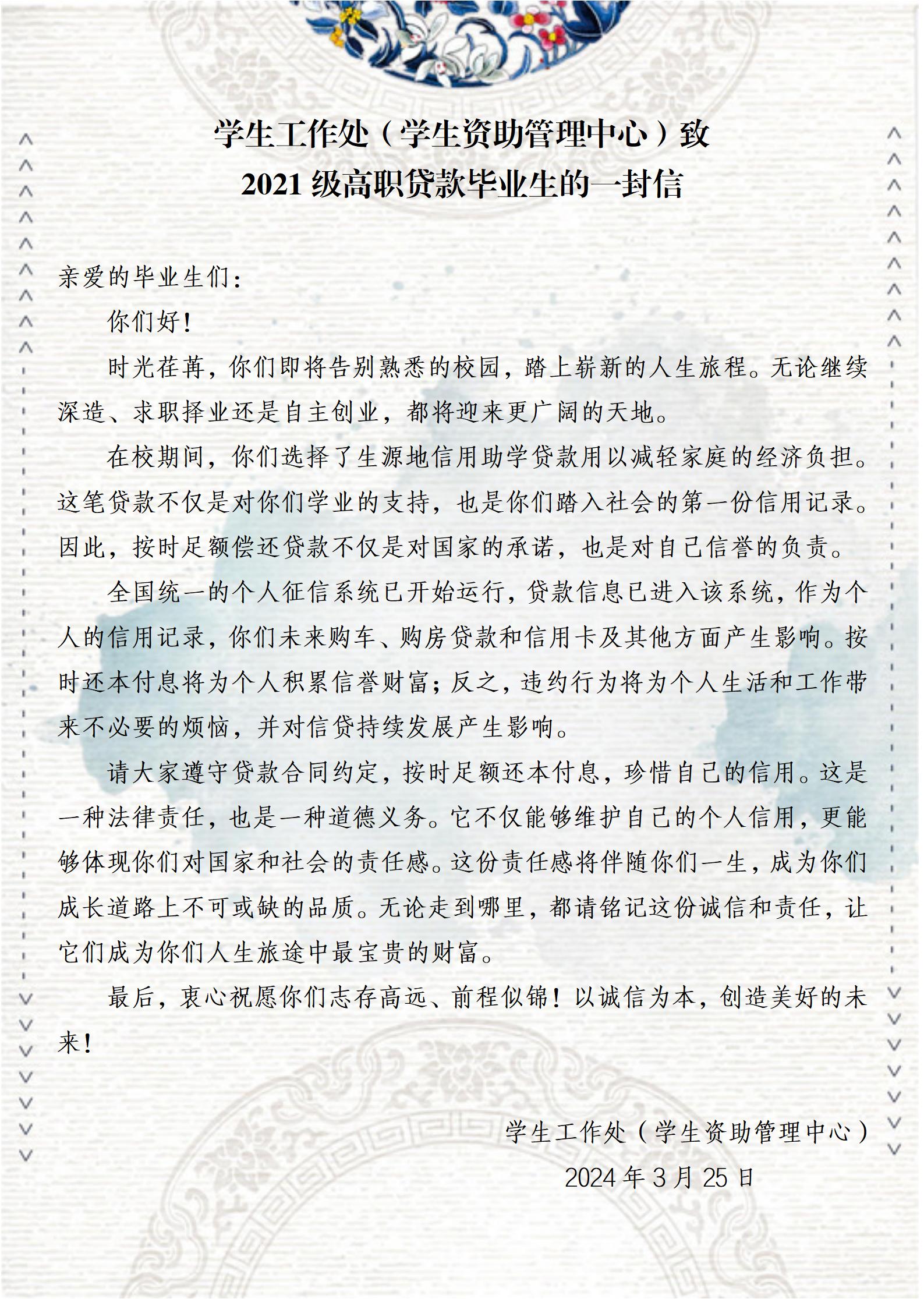 学生工作处(学生资助管理中心)致贷款毕业生的一封信